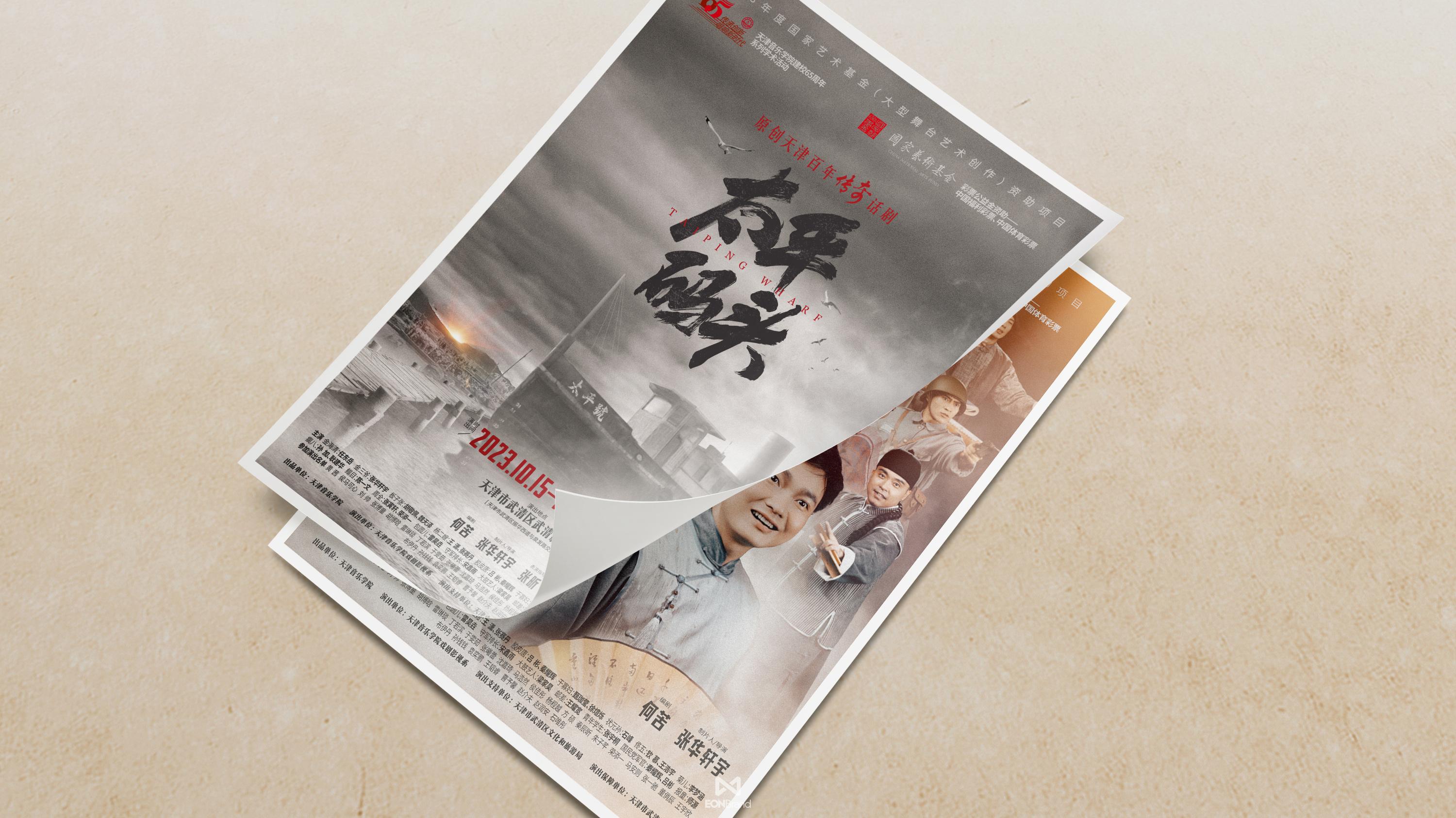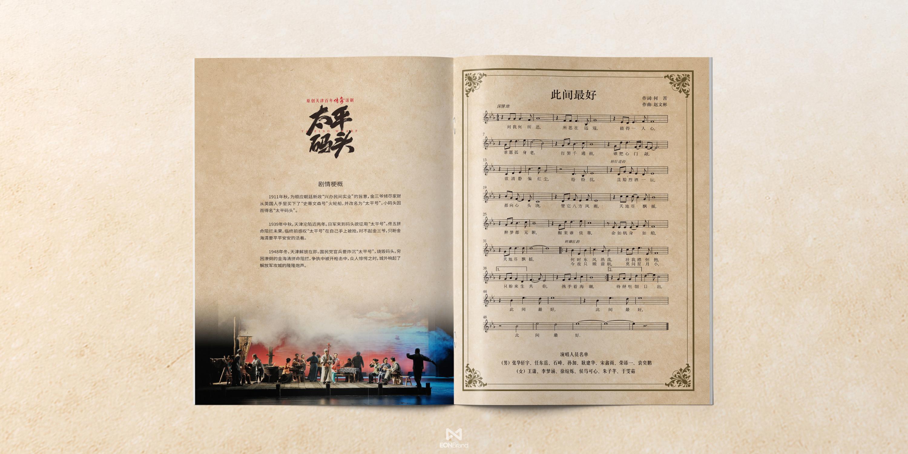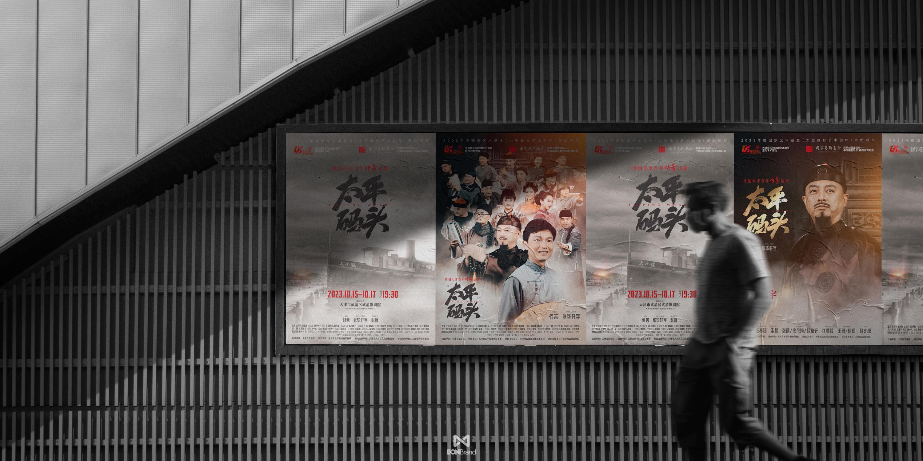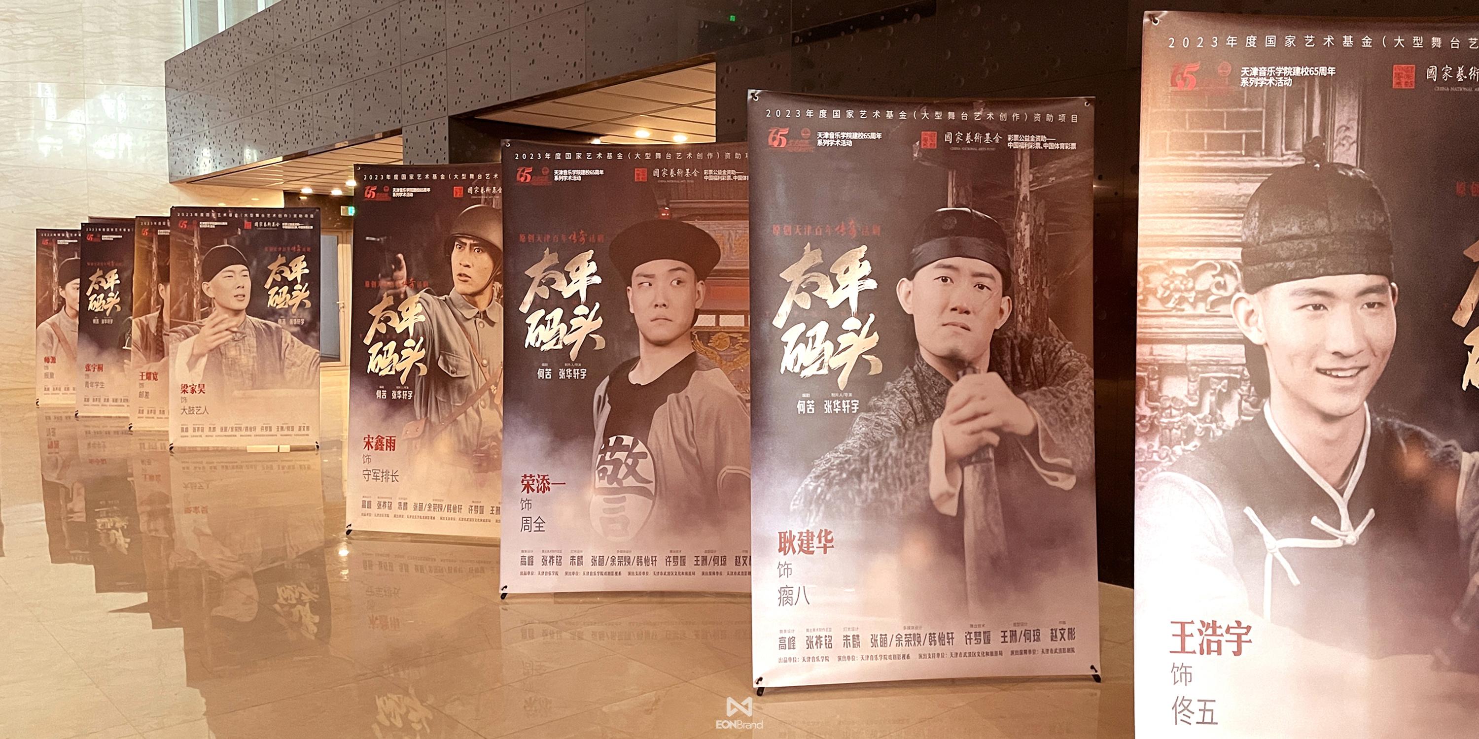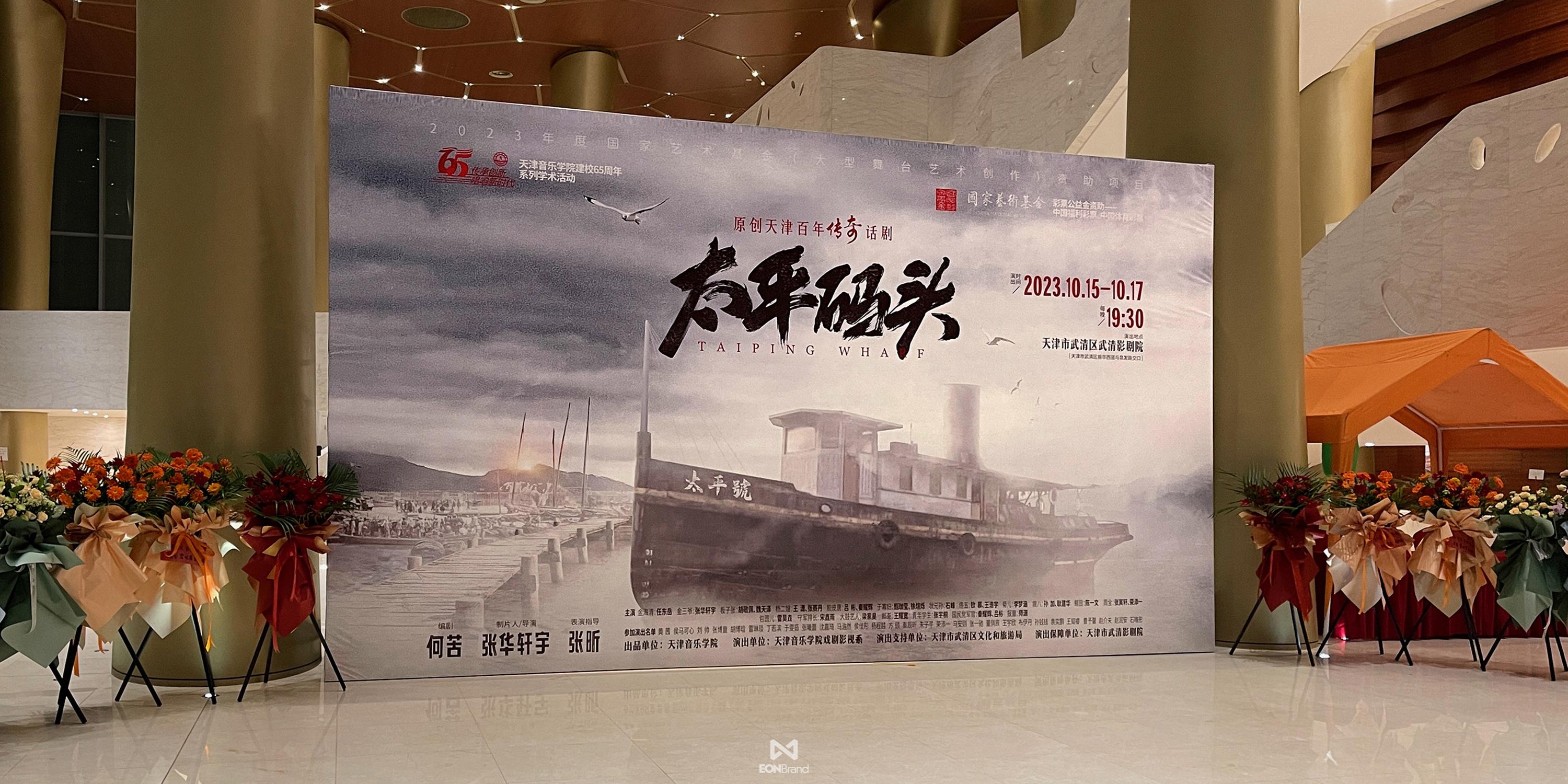 Tianjin Conservatory of Music carefully created the original Tianjin centennial legend drama "Taiping Pier" was set up on July 5, 2023, and successfully premiered at Wuqing Film Theater on October 15, 2023. The main creative team overcame many difficulties, with a high degree of professionalism, full of artistic enthusiasm, good spirit into the intense rehearsal that lasted for three months. More than 100 teachers and students conducted in-depth analysis of Tianjin's history, culture and humanistic features through four stages of script reading, rough arrangement, fine arrangement and synthesis, and finally made "Taiping Pier" appear on the stage. During this period, EONBrand designed the whole packaging process and cooperated closely, so that the overall packaging of the drama could be visually complete.